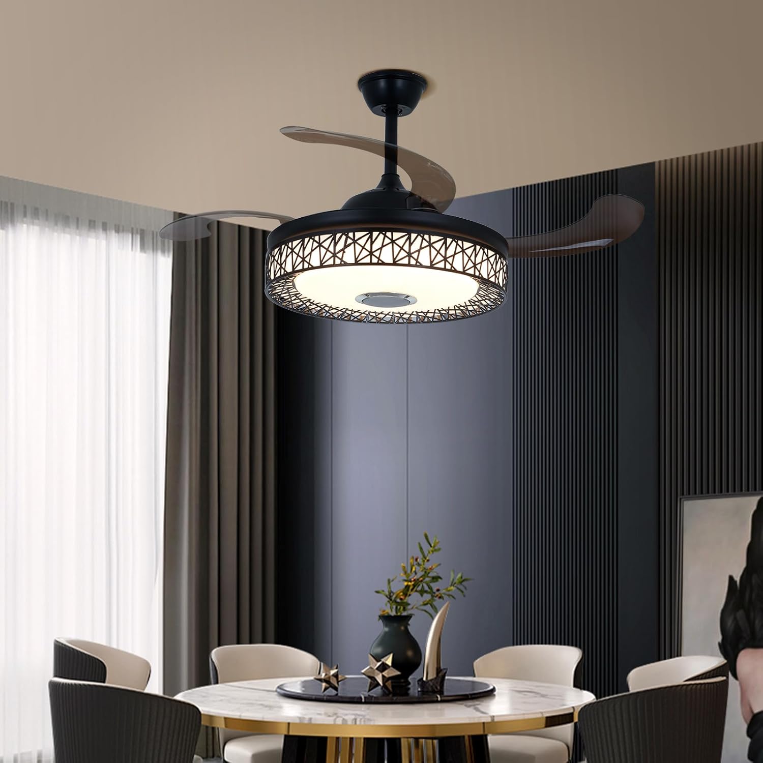 If you want a stylish, space-saving ceiling fixture that gives you light, airflow, and Bluetooth audio without adding three separate units, this 42-inch retractable-blade ceiling fan-chandelier is a compelling option. You’ll get an attractive, functional piece that suits many modern rooms, provided you accept that a multi-purpose unit performs best as a convenient all-rounder rather than a high-performance specialist.